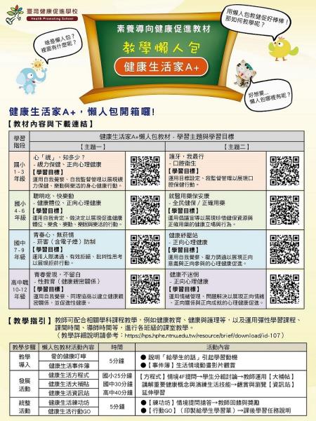 國教署說明,臺灣健康促進學校推動目前以WHO六大範疇為基礎,包括:學校衛生政策、物質環境、社會環境、社區關係、個人健康技能及健康服務,並統整評估學生共通性常見的健康需求,因地因校訂定主要推動或校本特色健康議題,並透過「健康生活家A+」教學懶人包教材,提供教師於教學時結合十二年國教素養導向,強化學生在生活情境中,透過親身參與、探究學習的歷程,產生健康覺知,精熟健康生活技能,以做出正確的決定並展現健康行為。