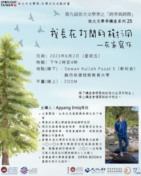 馬來西亞蘇丹依德里斯教育大學(Universiti Pendidikan Sultan Idris,UPSI)在文化部「臺灣文化光點計畫」支持下,即日起至6月17日舉辦第9屆文學季,以「跨界與跨際」為主題,多元呈現臺、馬文學作品,並邀請臺灣作家連明偉、太魯閣族作家程廷(Apyang Imiq),以及在臺生活創作的馬華作家黃錦樹、張錦忠出席專題演講及對談。