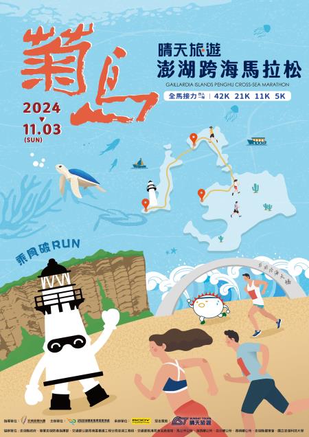 帶你迎風、跨海、看浪的菊島澎湖跨海馬拉松來囉!由交通部觀光署澎湖國家風景區管理處(下稱澎管處)所主辦的第七屆「2024菊島澎湖跨海馬拉松」即將於113年11月3日(星期日)盛大登場,今年特別由晴天旅遊冠名贊助,結合澎湖最美麗海岸線賽道、超澎湃的海鮮、在地美食補給、熱鬧應援團以及多元的人文特色,打造別具特色的馬拉松賽事,今年更與「沖繩馬拉松」合作相互宣傳,邀請海內外跑友共襄盛舉,一起乘風破RUN!