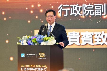 行政院副院長鄭文燦18日出席由工業技術研究院主辦的「2023 ITRI NET ZERO DAY-打造淨零時代競爭力」論壇暨特展時表示,淨零是環保議題,也是經濟議題,為積極達成淨零排放目標,行政院長陳建仁上任後即核定「淨零排放路徑112-115綱要計畫」,政府也積極推動再生能源發展,包括太陽能、風力發電、地熱及生質能等,並推動綠色運輸,希望建立完整的電動車產業生態系。至盼透過本次論壇,協助產業在低碳製造及碳排放管理機制等方面尋求解方,穩健達成淨零轉型的目標。