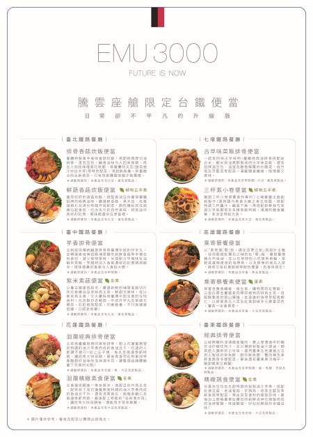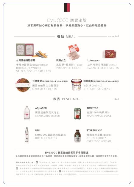 為進一步提升服務品質,臺鐵局自今(112)年9月1日起調整EMU3000型騰雲座艙餐點換新菜色,以滿足老少咸宜的口味需求。騰雲座艙新餐點(5擇1)包含台灣優格餅乾學院「千層棒餅乾盒」(肉鬆+鹹蛋黃口味各3個) 、微熱山丘(鳳梨酥+蘋果酥各1個)、比利時蓮花脆餅(全素)、騰雲座艙限定台鐵便當或哈根達斯冰淇淋;飲品(4擇1)則包含騰雲座艙限定AQUAGEN氣泡水、EMU3000型設計款瓶裝水、樹頂蘋果汁或星巴克特濃咖啡拿鐵多樣化選擇,能滿足每位旅客不同的喜好。