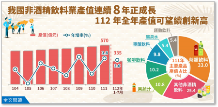 3.112年我國非酒精飲料業產值可望延續成長態勢再創新高:我國非酒精飲料業產值112年累計1-7月已達335億元,年增3.6%,各產品中除了其他非酒精飲料因機能性飲料之海外訂單縮減而年減5.9%外,其餘各項飲品皆呈現正成長;在業者持續推出新品及各種促銷活動的帶動下,112年全年產值可望延續近8年的成長態勢,再創歷史新高紀錄。