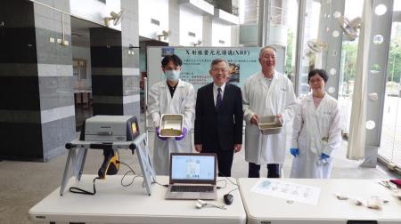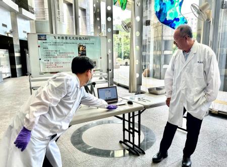 「真金不用火煉,XRF報你知」XRF(X射線螢光光譜儀)可以鑑定貴金屬組成與含量,也適用於古文物、藝術品的真偽鑑定,是一種快速、非破壞式的測量方法,國環院主任楊喜男指出,XRF最初開發目的是運用於玩具表面重金屬檢測,國環院巧妙利用本項儀器特性,在污染現地進行快篩,即可快速辨識金屬成分並定出受污染需整治的範圍,後續僅需帶回少量污染標的樣品,便可在實驗室進行鑑識分析,這個簡單而經濟實惠解決方案,大幅減少污染採樣及後續檢測成本。