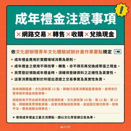 文化部表示,依「文化部辦理青年文化體驗試辦計畫作業要點」規定,成年禮金應用於實體場域消費為原則;成年禮金之使用不得找零、轉售,亦不得另再兌換成等值現金;店家應對於所提出憑證之交易事實及真實性負責。對於違反相關規定者,文化部得撤銷民眾領取資格、店家收款資格,並追回已撥付款項。同時,民眾或店家違法利用文化幣獲取不當利益的行為,可能涉及刑法第339條詐欺罪,最高可處5年有期徒刑,以及第214條使公務員登載不實罪,最高可處3年有期徒刑,並沒收不法所得,提醒民眾切勿以身試法。