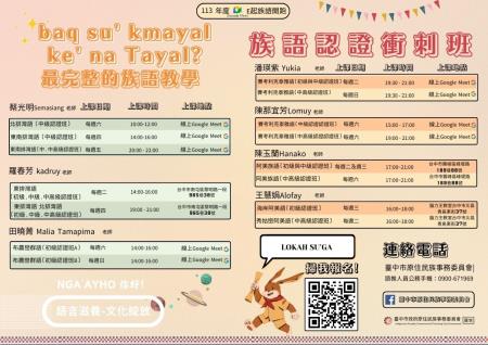 1.113年度族語認證衝刺班開跑囉,為保護、保存和傳承原住民族語,及培訓本市市民考取族語認證證書,透過語言推廣人員開設113年度族語認證衝刺班,分別有泰雅族、阿美族、排灣族及布農族四種語別,請有意報名者掃描QR code填寫相關資訊,報名完成後,請電詢本會語言推廣人員確認,連絡電話:0900-671969。