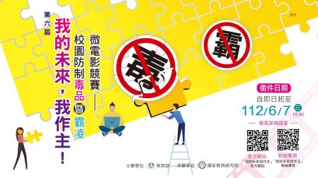 教育部第六屆「我的未來我作主」微電影競賽開始徵件囉!本競賽鼓勵學生以「防制毒品」及「防制霸凌」為題材,發揮創意拍攝7分鐘內的微電影,一起向毒品及校園霸凌說NO。徵件時間自即日起至6月7日截止,首獎獎金高達15萬元,歡迎青年學子發揮創意,踴躍報名參賽。