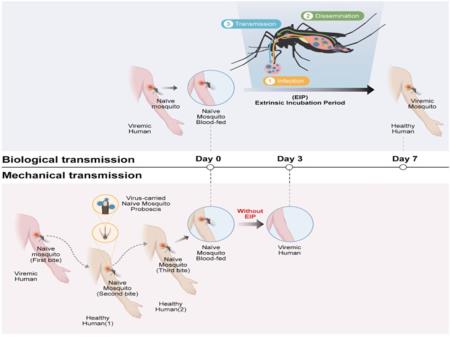 過去科學家認為病毒從染病病患經蚊子叮咬後,需要在蚊蟲體內完成多次複製,再由中腸感染至唾腺,才能在蚊子叮咬下一個人時完成傳播,這個過程至少需要8天,發病間隔至少10天以上,稱為外源性潛伏期(Extrinsic Incubation Period,EIP)。然而國衛院與高雄市衛生局合作分析2015年疫情的發病時序,發現同家戶內的發病間隔有八成五少於3天,研究團隊利用動物實驗証實蚊子叮咬被病毒感染的動物後緊接著叮咬下一隻動物,蚊子口器上沾染的病毒即可完成病毒傳播造成感染,類似於HBV、HCV、HIV共用針頭的傳染模式。