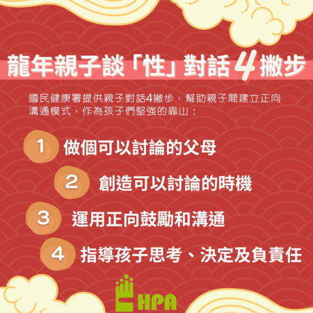 春節假期即將來臨,適逢學生放寒假,與家人相聚的時間稍微有所增加,讓求學或工作的家人能夠團圓相聚,在輕鬆無壓力的情況下,有機會互相分享生活近況及聊聊未來規劃,話題中遇到「性」相關的議題往往會是難以啟齒或輕輕帶過的情況。國民健康署吳昭軍署長建議,家長們不妨透過春節假期、平常家庭聚會或旅遊等親子互動的時機,試著與家中的青少年開啟性健康對話,透過親子間的坦誠交流,引導和給予成長過程中的支持,讓孩子可以更加理性及健康地面對自己的身體和情感。