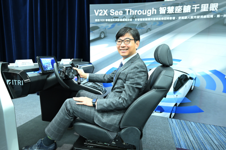 第三項為「智慧座艙V2X See through」,工研院創新專利研發「V2X See through」技術,結合V2X車載通訊、影像辨識、影像縫合技術,提供駕駛前車的穿透融合影像,透過車載裝置、運用5.9 GHz ITS專用頻段於車間互傳訊號,即可掌握前方車輛視角的行車影像,讓駕駛就像獲得千里眼可掌握前車視野。希望協助我國車電業者,打入全球突破千億美元的車用安全市場,可應用於智慧車隊。