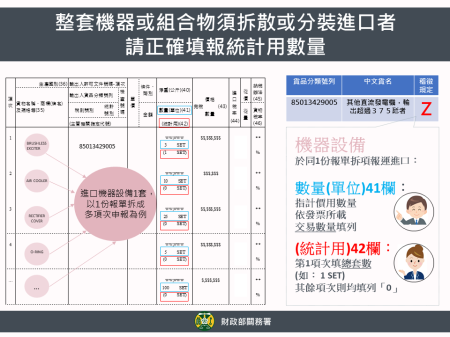財政部關務署表示,進口報單中數量欄位有二種,一為第41欄數量(單位),係指計價用數量,請依發票所載交易數量填列;另為第42欄數量(統計用),請以「中華民國海關進口稅則輸出入貨品分類表合訂本」上單位欄內所載單位算出數量後填列,以利取得單位一致之數值。海關呼籲當廠商進口整套機器或由數種物品組合而成之貨物,如因體積過大或其他原因須拆散、分裝報運進口者,為避免重覆列計及虛增統計用數量,廠商應分別於主機設備或第1批進口報單第1項次之數量(統計用)欄填列其總套(組)數,其餘項次及嗣後分批進口時該對應欄位則均應填列「0」,才不至造成統計數量失真。