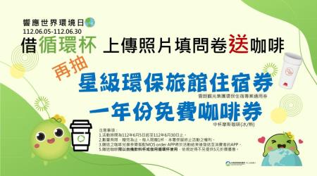 環保署表示,感謝業者對環保各項政策的響應及支持,此次在世界環境日特別舉辦借循環杯的好康活動,就是要鼓勵民眾踴躍體驗並借用,活動期間無論您到哪個通路借用循環杯,只要拍照上傳環保署的粉絲團活動貼文留言、完成步驟並寫填寫問卷,前1,000名完成的有效問卷就能獲得摩斯咖啡乙杯,此外還會從完成的問卷中抽出5名「雲朗觀光集團星級環保住宿券」以及3名「一年份」中杯摩斯咖啡券(限用自備杯或借用循環杯兌換),讓您體驗環保享優惠!