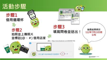 環保署去(111)年4月起公告「一次用飲料杯限制使用對象及實施方式」, 112年開始連鎖超商及連鎖速食店業者需要有一定比率的門市需提供循環杯借用服務並逐年提高門市的比率。
