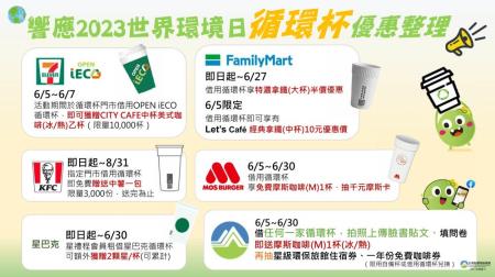 除了環保署舉辦活動之外,業者在紛紛推出優惠活動共襄盛舉,7-ELEVEN自 6/5起至6/7止推出「借OPEN iECO循環杯免費喝咖啡活動」,活動期間於循環杯服務門市成功借用OPEN iECO循環杯,即可獲贈CITY CAFE中杯美式咖啡(冰/熱)乙杯(限量10,000杯);全家便利商店則推出「循環杯雙重優惠方案」,即日起到6/27止,消費者在「全家」440間限定店舖,不僅能夠免費借用循環杯,還可享有特濃拿鐵(大杯)半價優惠;6/5環境日限定,借用循環杯即可享有Let’s Café經典拿鐵(中杯)10元的綠色優惠價;速食業者部分,肯德基推出「借用循環杯」活動,即日起至112年8月31日止,指定門市借用循環杯即免費贈送中薯一包,數量有限送完為止;摩斯漢堡於6/5-6/30推出借用循環杯享用免費摩斯咖啡(M)1杯再抽千元摩斯卡,星巴克推出即日起至6/30,活動期間登入星禮程會員於指定門市完成租借星巴克循環杯乙杯,可額外獲贈2顆星/杯(可累計)。邀請大家一同體驗循環杯服務!