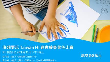 「海想要玩 Taiwan Hi 創意繪畫著色比賽」於即日起至112年8月31日下午5時止受理徵件,為了激發及鼓勵孩子們的創意及無限的想像力,本次活動準備了最高獎金1萬元,另還有評審獎與人氣獎等獎項及獎金,活動辦法請上官網查詢(
