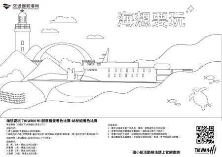 暑假到來,您是否已經為孩子的暑假活動做好了準備? 交通部航港局於6月27日正式發表「TAIWAN Hi海洋運輸品牌」,致力於提升海上「航、港、船、遊」交通運輸服務品質。為了啟發孩子對海洋的熱愛,讓孩子從小開始就接觸海洋教育,瞭解海洋、進入海洋、喜歡海洋,透過藝術的方式深化孩子對「藍色公路海洋旅遊」的認識。交通部航港局表示,自即日起至112年8月31日推出「海想要玩 Taiwan Hi 創意繪畫著色比賽」,讓孩子可以充分發揮對海洋的想像力及創造力。