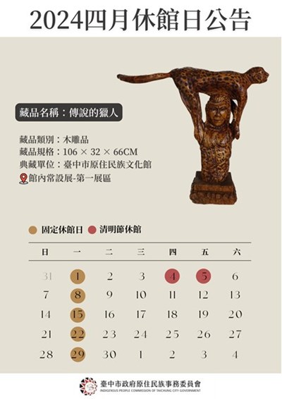 臺中市原住民族文化館四月份的休館時間公告如圖,想要到館參觀的朋友要留意一下喔!