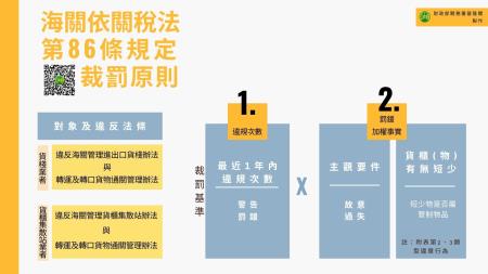 欲更進一步瞭解裁罰原則,歡迎至關務署官網(路徑:首頁>資訊匯流>業務公告>最新業務公告),搜尋「海關依關稅法第八十六條規定裁罰原則」,參閱相關裁罰基準。