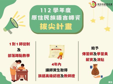 原民會24日核定5所原住民族語言師資培育重點大學推動「#112學年度原住民族語言師資拔尖計畫」,共有卑南族、鄒族、賽夏族…等9族53組師徒,透過師徒制1對1面授及部落蹲點的傳習策略,快速培育師資生兼具教育專業知識及族語能力,目標4年內讓參與的公費師資生取得族語高級認證及教師證,加入族語師資行列。