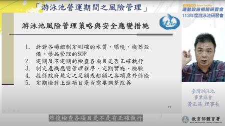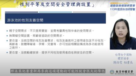 為協助國內游泳池業者打造安全、優質、友善的游泳池運動環境,並提升業者游泳池經營管理、硬體維護、消費者保護及風險管理等全方位知能,教育部體育署今(113)年規劃一系列的線上研習課程,自5月6日至19日將於YouTube平臺進行播放,近150名游泳池從業人員及地方政府承辦人參與。