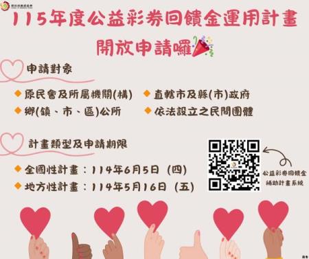 📣原民會115年度公益彩券回饋金運用計畫開放申請囉!!